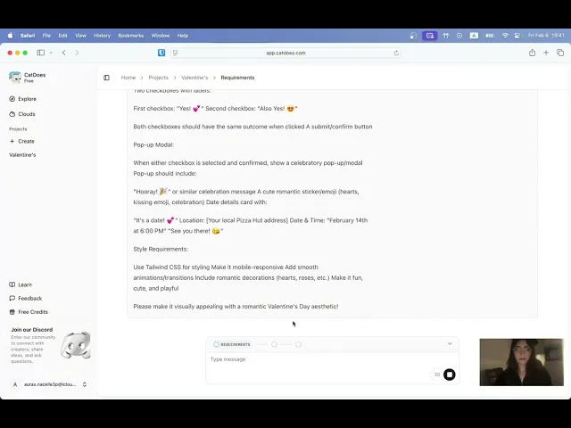 Video walkthrough (1:15): A new project named "Valentine's" is created on CatDoes. A prompt is pasted into the requirements agent, which hands the project to the design agent. A live phone preview populates in real time with a working UI (hearts, themed buttons, Valentine's screens). The finished app can be tested on a real phone by scanning a QR code with Expo Go.