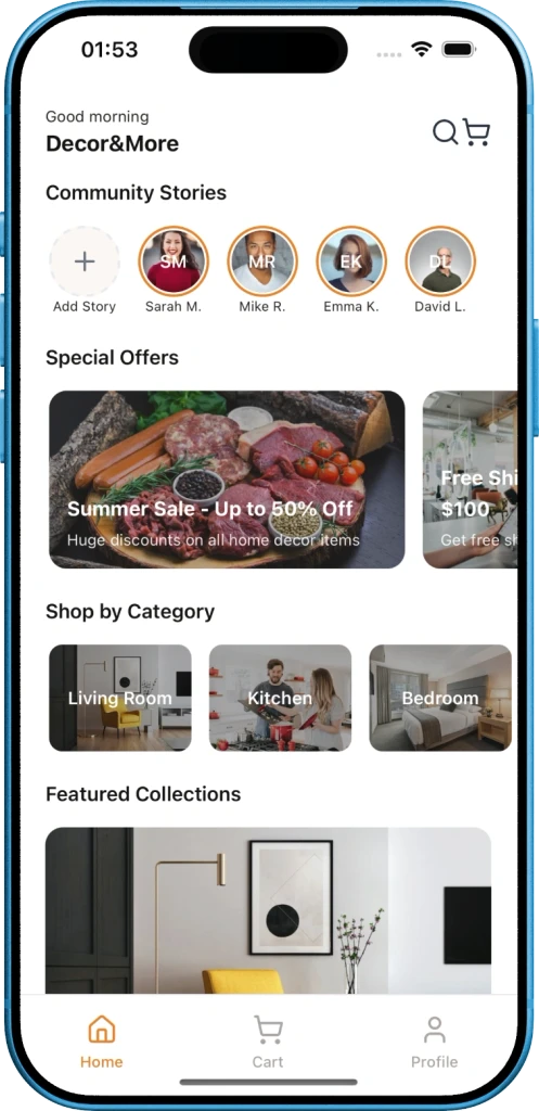 CatDoes AI agents handle requirements, design, and code. You get a real, working mobile app — not a mockup. Full UI, navigation, and backend powered by CatDoes Cloud.